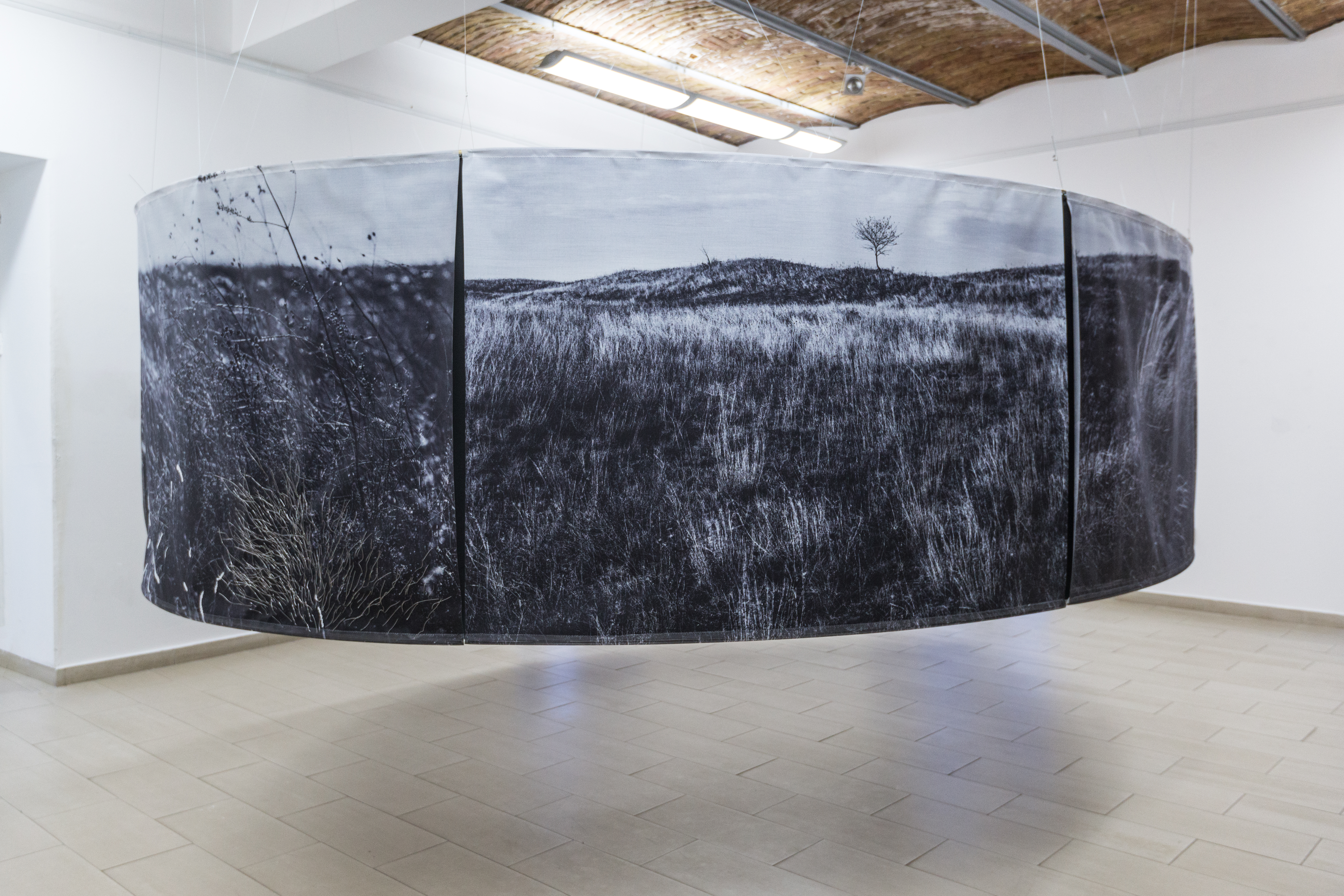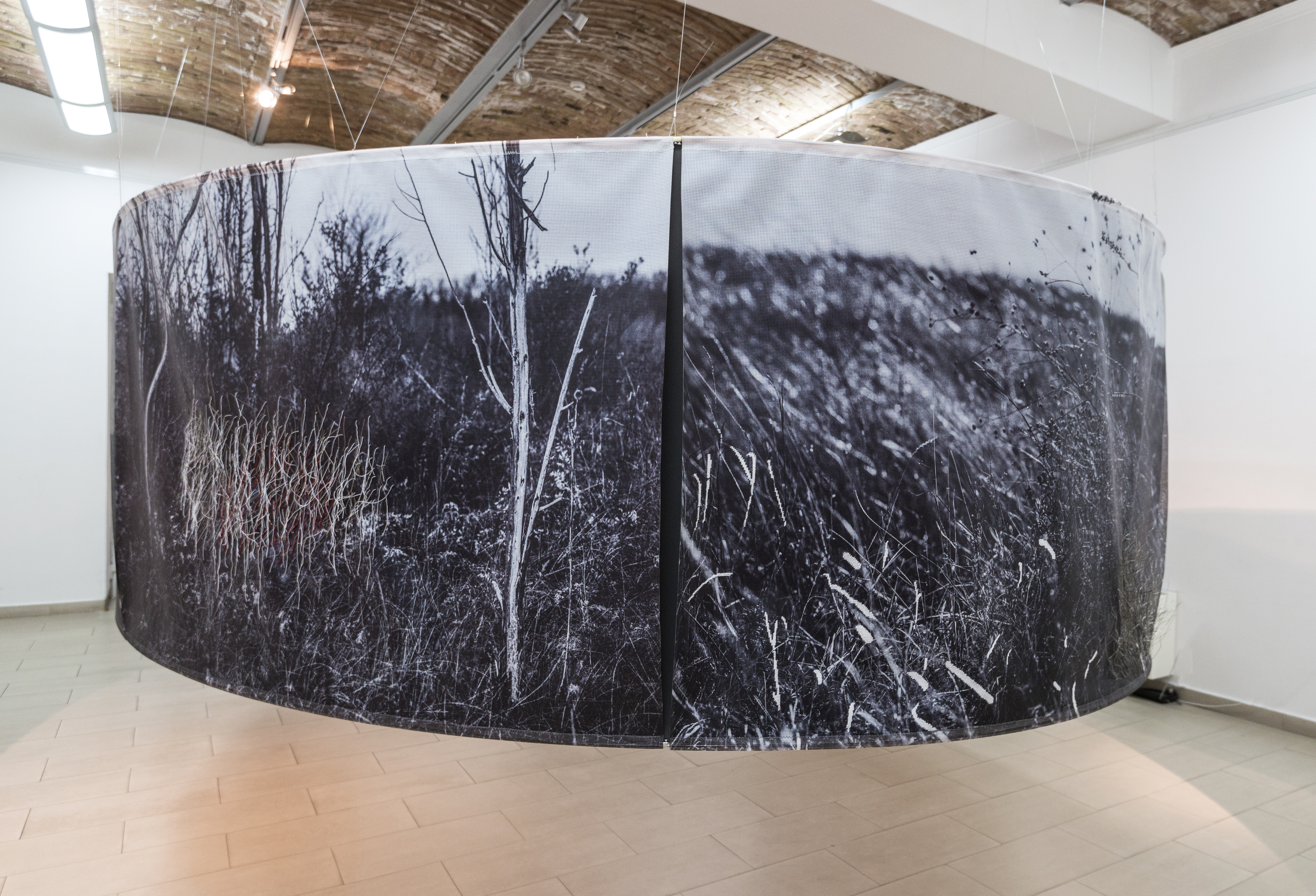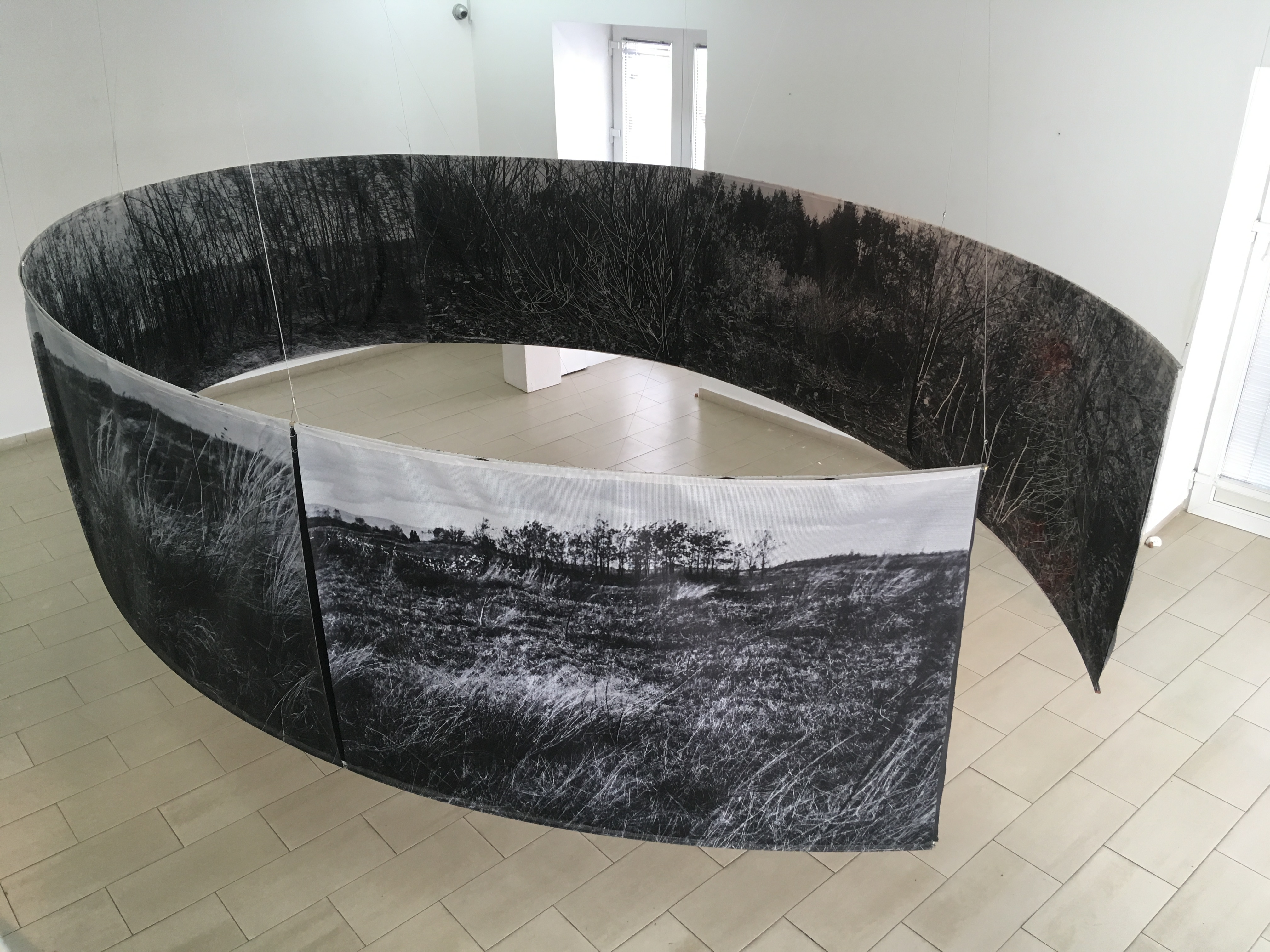 The installation in the space consists of 14 photographs in 180x120 cm format. In the photographs, interventions were made in the form of weaving with wire and wool, which expands the two-dimensional space of the photographic landscape to three-dimensional space, so to speak, the landscape "enters" space and conquers it - conquers the observer or better said the participant in the landscape. Landscape interventions are a natural continuation of the motif in photography and bring it to life. The observer/participant is invited to freely touch the landscape and all its artefacts, with a warning that he may be injured (by the sharpness of the wire) just as in a real landscape. Through this installation, I re-examine the possibility of "transferring" the landscape beyond its reality, bringing it into the fictional reality of art. Landscape as an intimate space is the last refuge of humanity. By imitating the intimate (space), I remind the participants/viewers of their origin, of the need for intimacy, for touch, an emotion that arises from a completely personal experience and active participation. The circular shape of the installation is associated with a kind of ritual modelled on the ancient pagan customs through which people communicate with nature and the "higher forces" they considered superior. The repetitiveness of photographs (similar to the motifs shown on them) distracts the viewer from the traditional viewing of a photograph as the ultimate experience and directs him towards perceiving the whole. That whole changes its expression depending on the place where the viewer is. External and internal viewing of the setting implies a sensory and intellectual experience of one and the same scene. The installation is accompanied by sound by Marko Jevtić.