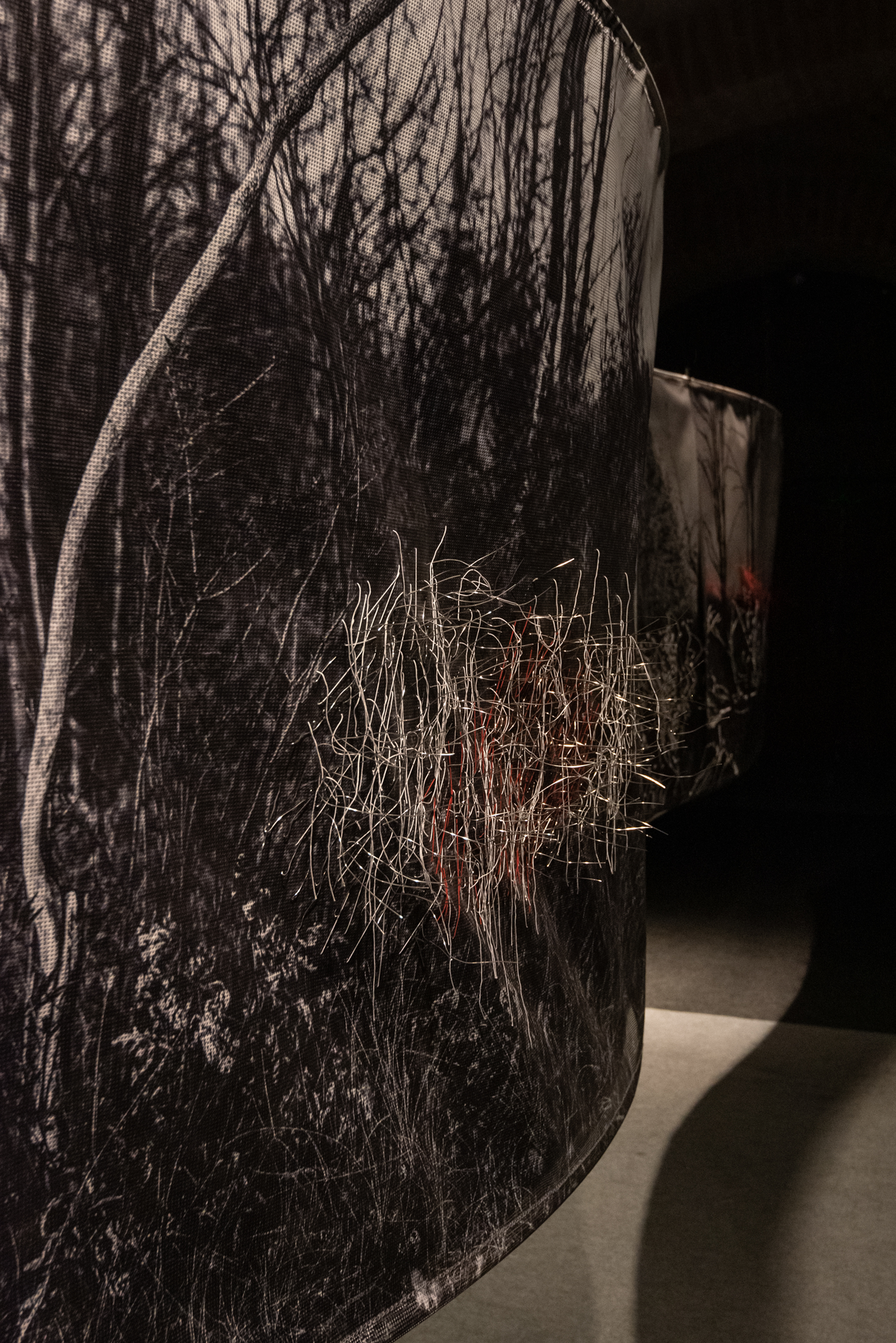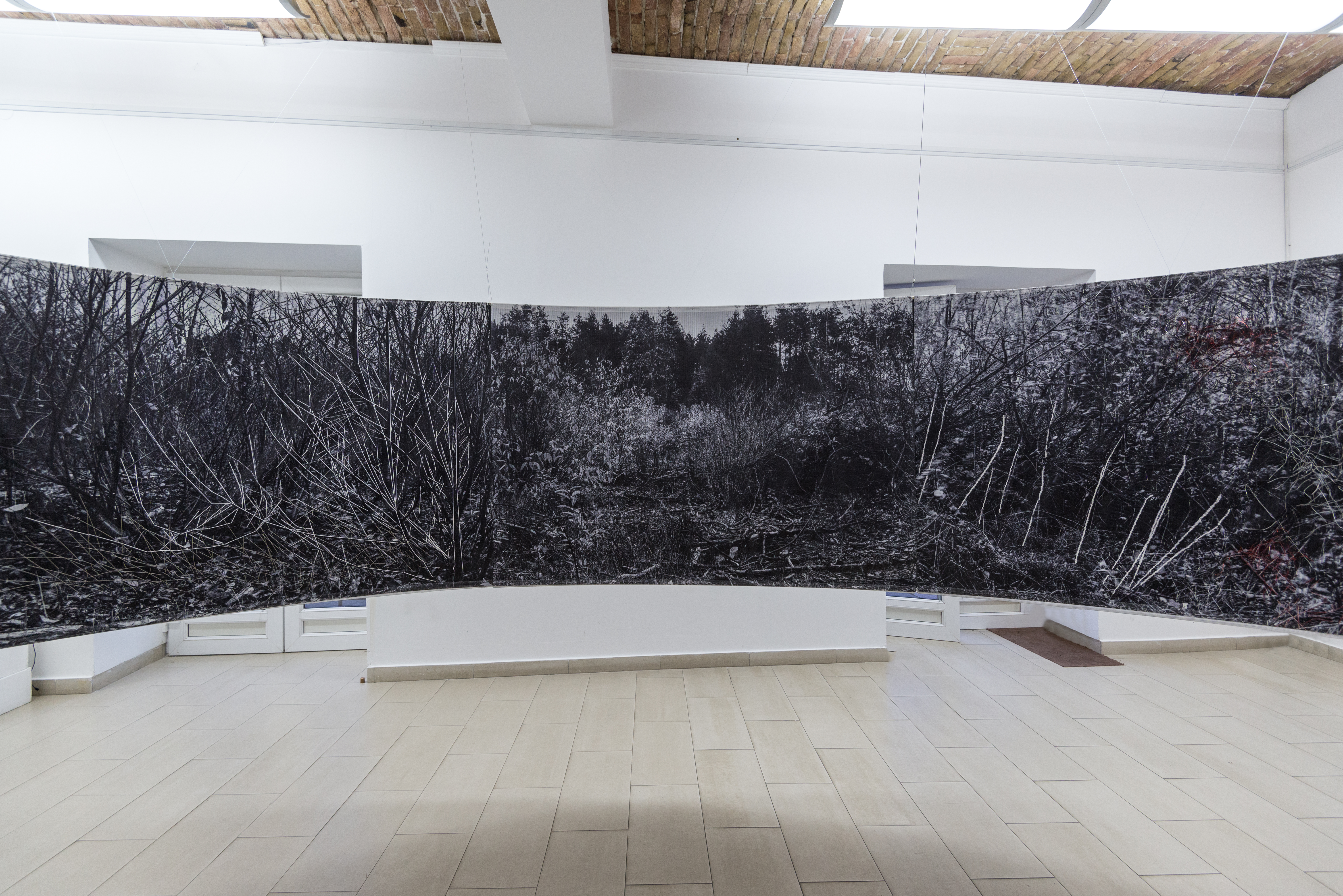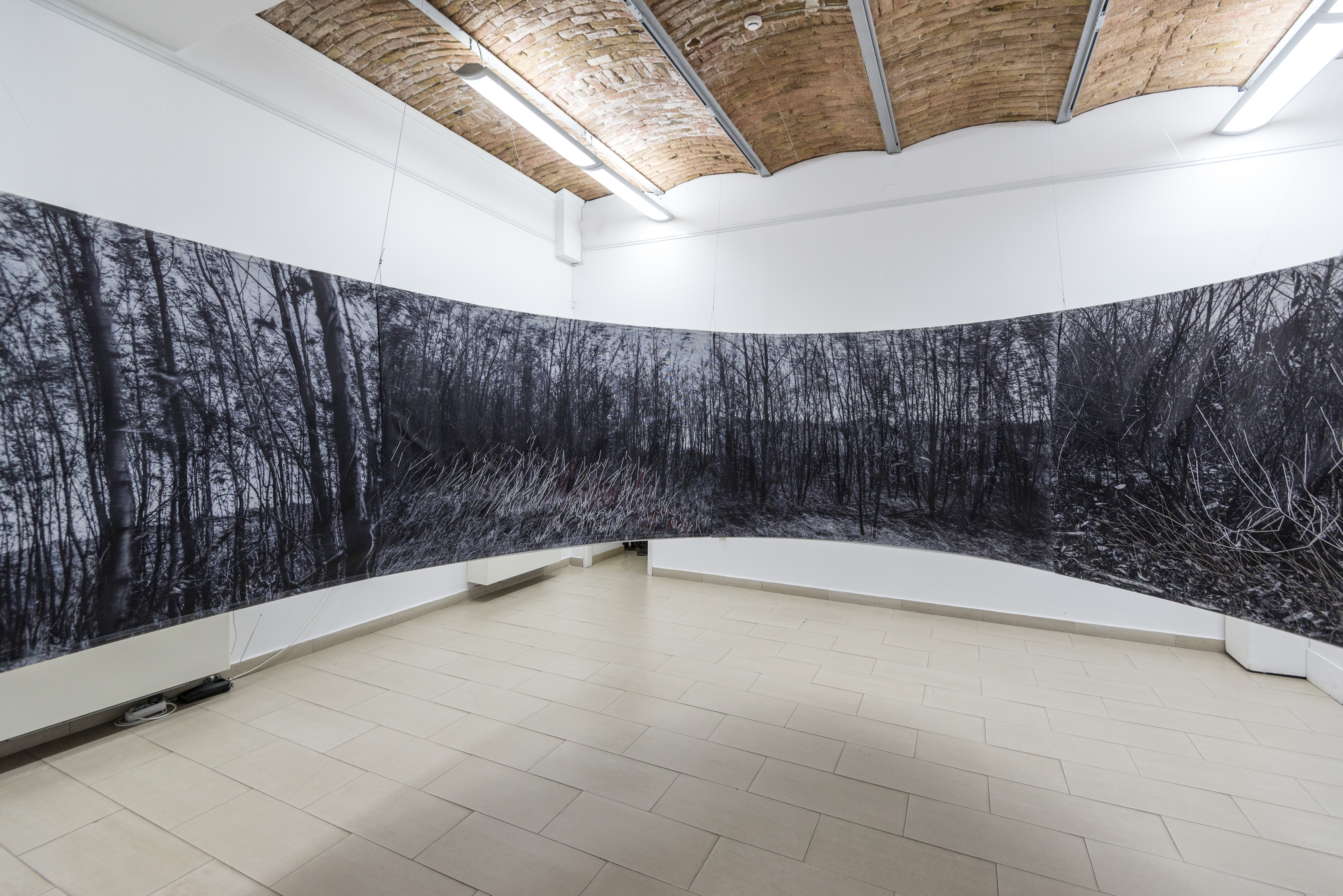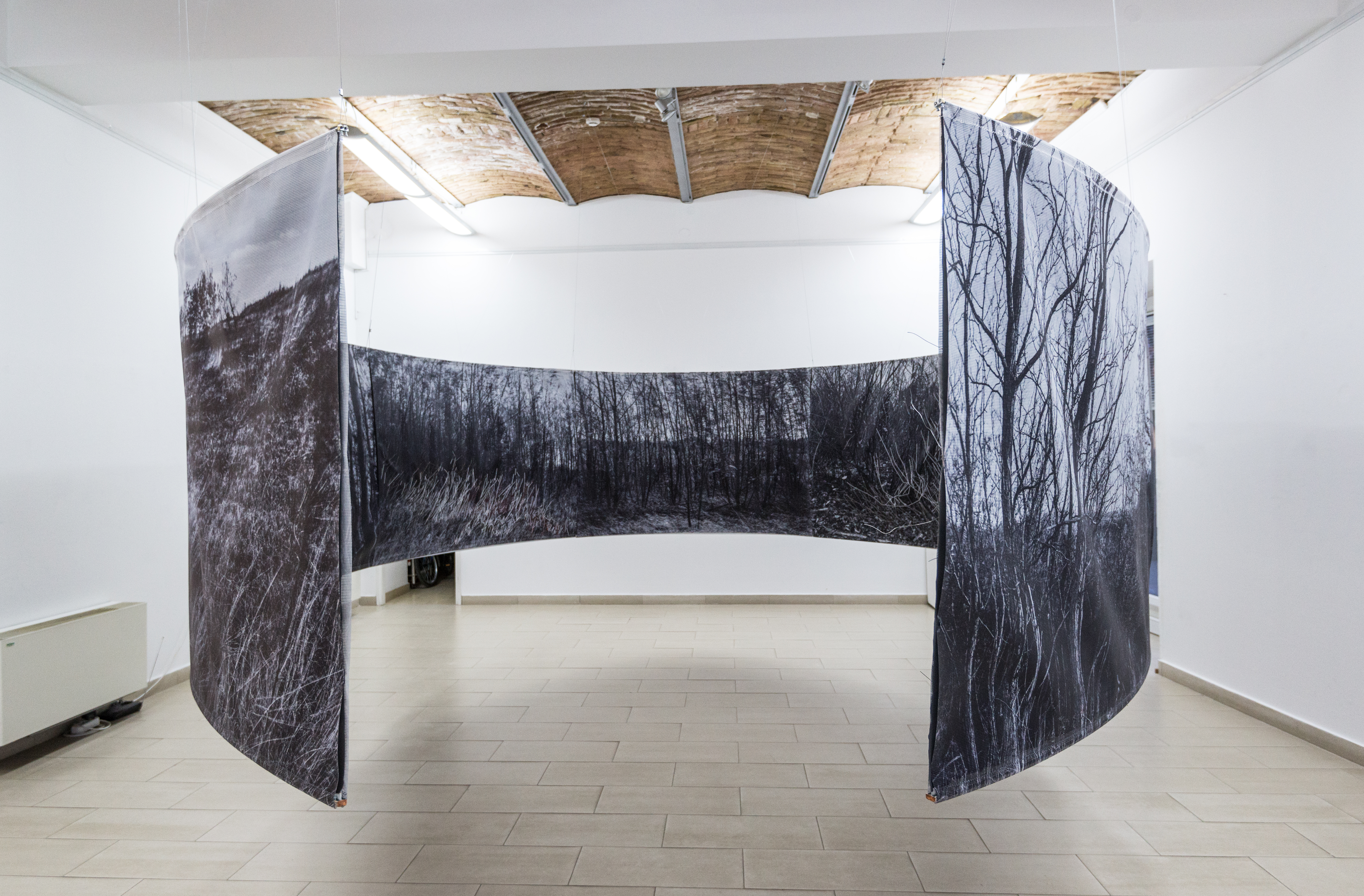 The installation in the space consists of 14 photographs in 180x120 cm format. In the photographs, interventions were made in the form of weaving with wire and wool, which expands the two-dimensional space of the photographic landscape to three-dimensional space, so to speak, the landscape "enters" space and conquers it - conquers the observer or better said the participant in the landscape. Landscape interventions are a natural continuation of the motif in photography and bring it to life. The observer/participant is invited to freely touch the landscape and all its artefacts, with a warning that he may be injured (by the sharpness of the wire) just as in a real landscape. Through this installation, I re-examine the possibility of "transferring" the landscape beyond its reality, bringing it into the fictional reality of art. Landscape as an intimate space is the last refuge of humanity. By imitating the intimate (space), I remind the participants/viewers of their origin, of the need for intimacy, for touch, an emotion that arises from a completely personal experience and active participation. The circular shape of the installation is associated with a kind of ritual modelled on the ancient pagan customs through which people communicate with nature and the "higher forces" they considered superior. The repetitiveness of photographs (similar to the motifs shown on them) distracts the viewer from the traditional viewing of a photograph as the ultimate experience and directs him towards perceiving the whole. That whole changes its expression depending on the place where the viewer is. External and internal viewing of the setting implies a sensory and intellectual experience of one and the same scene. The installation is accompanied by sound by Marko Jevtić.