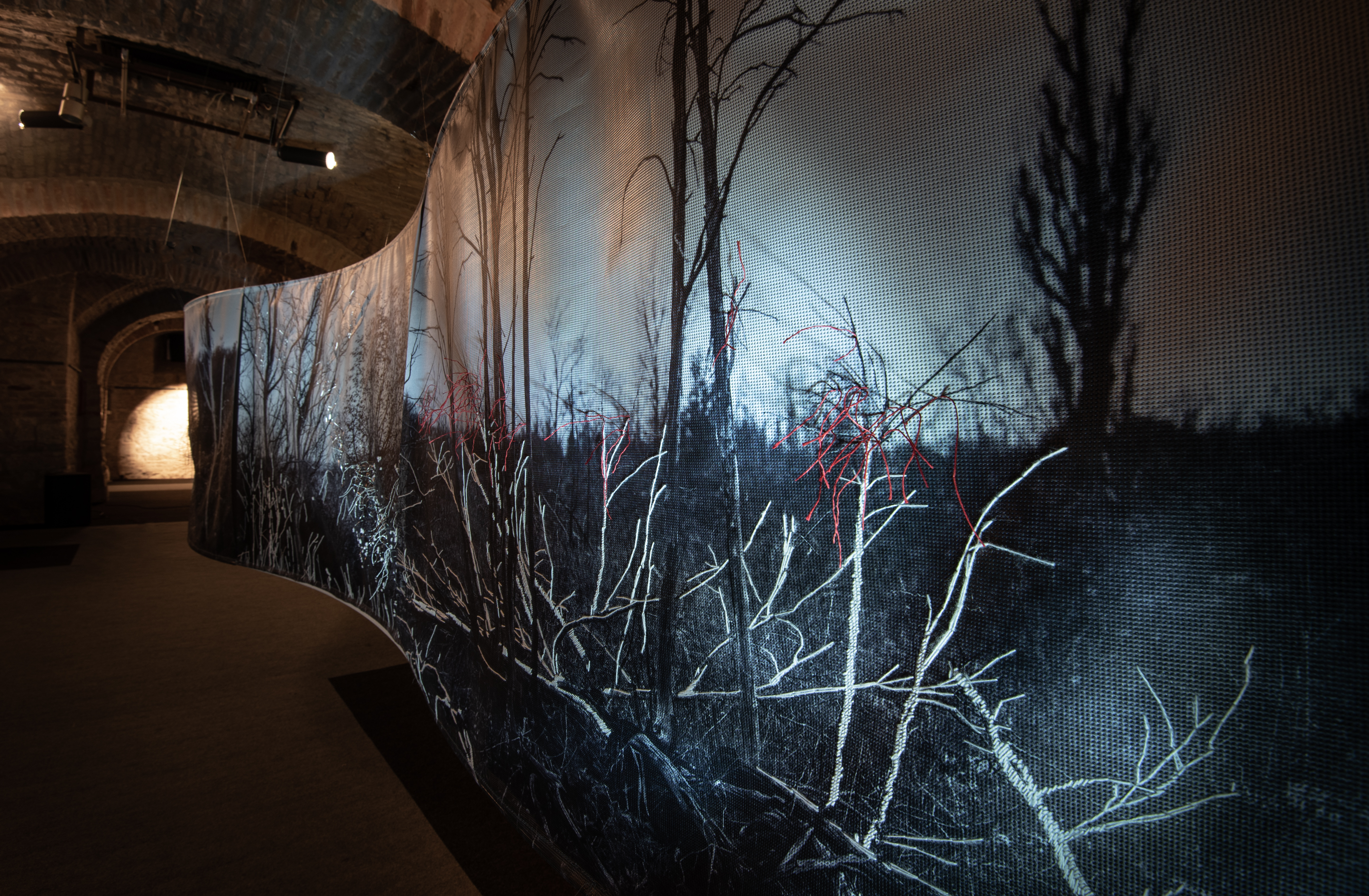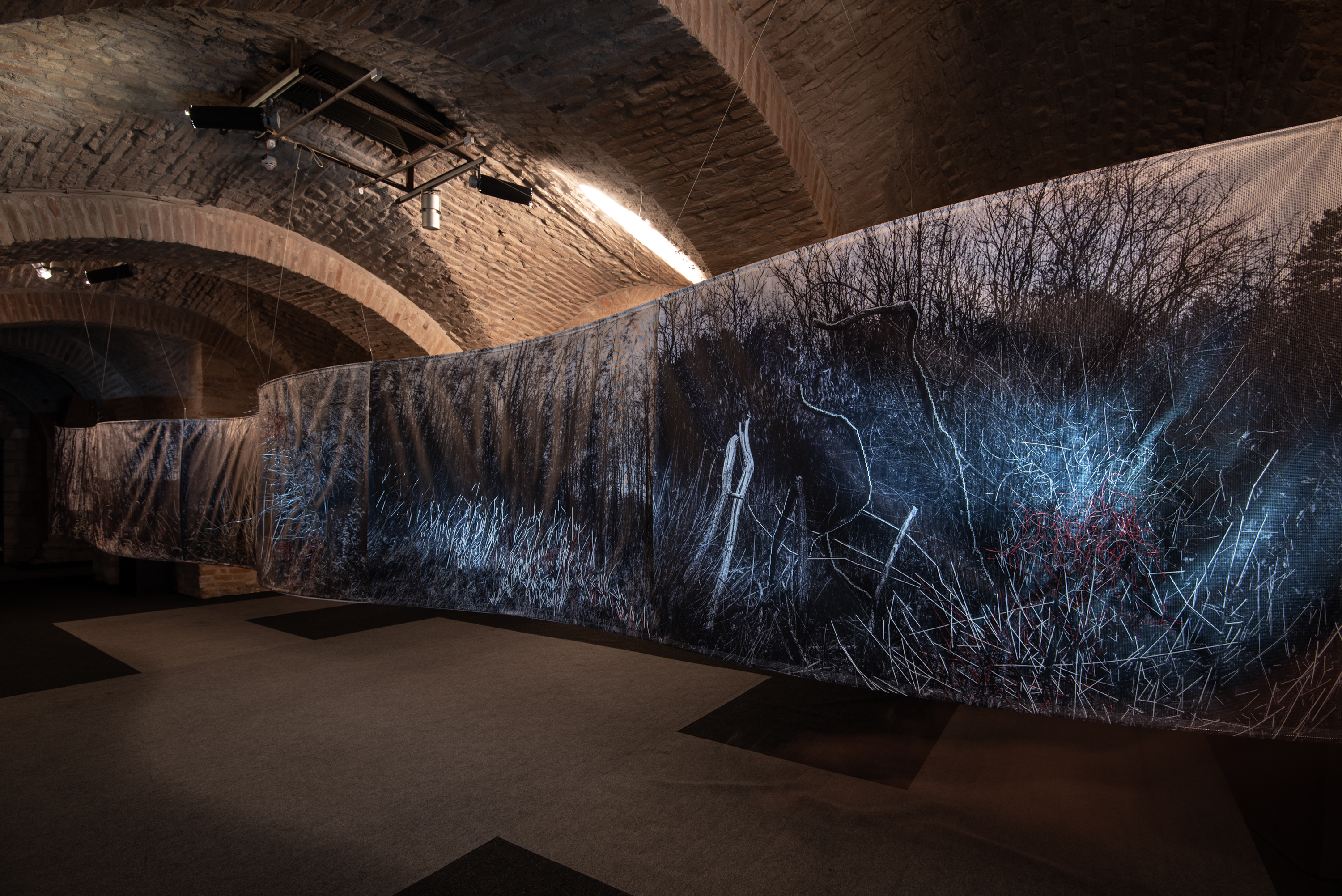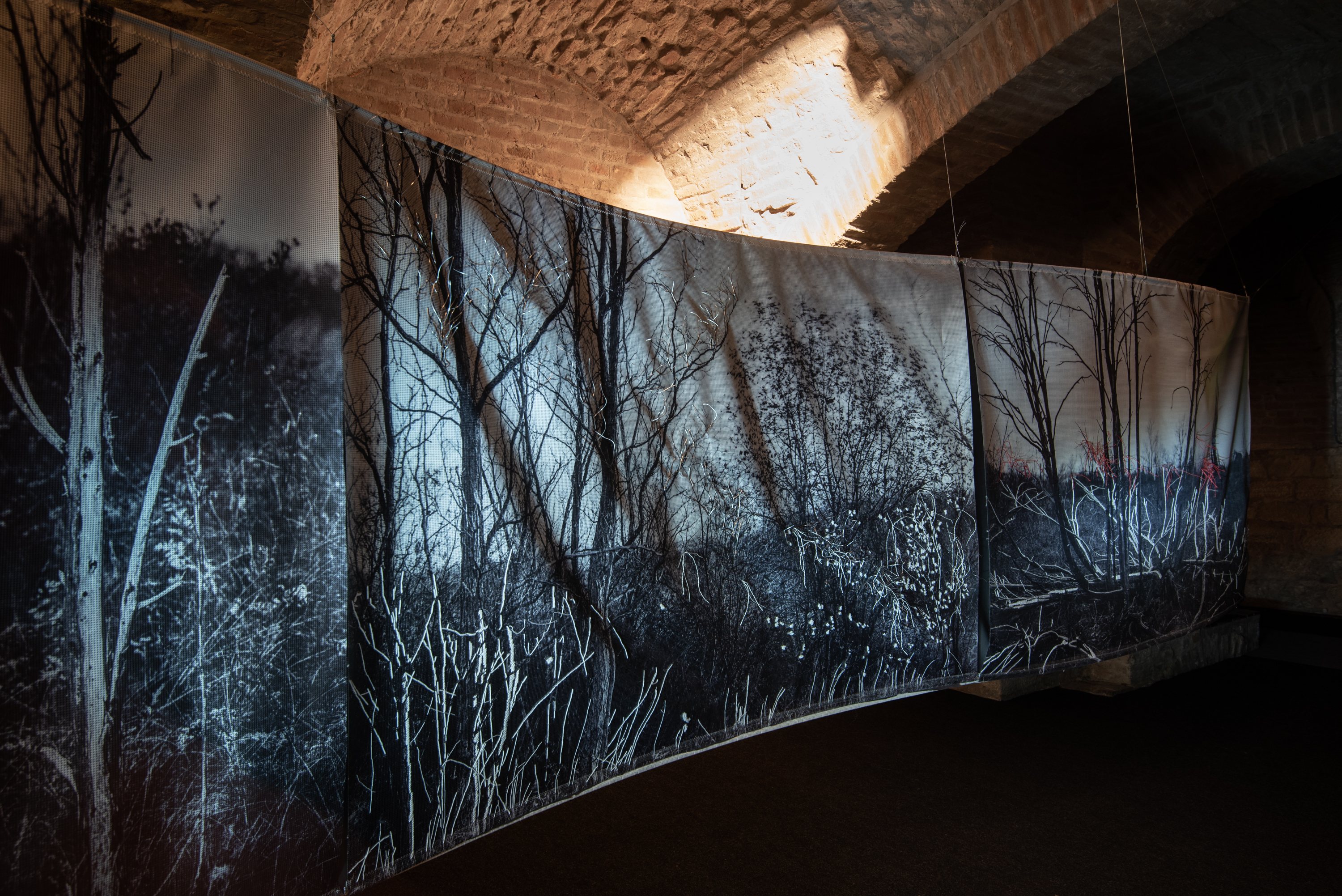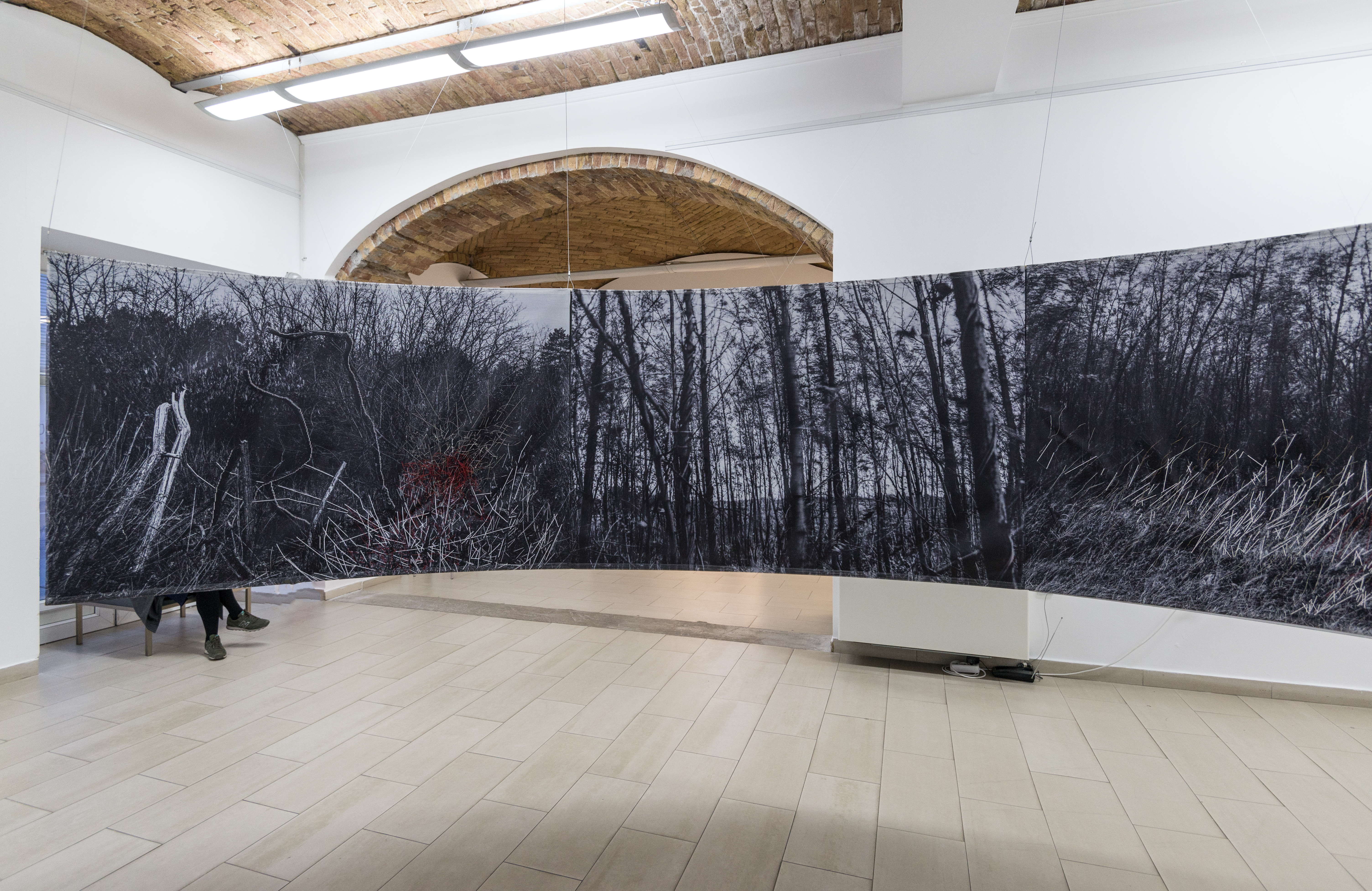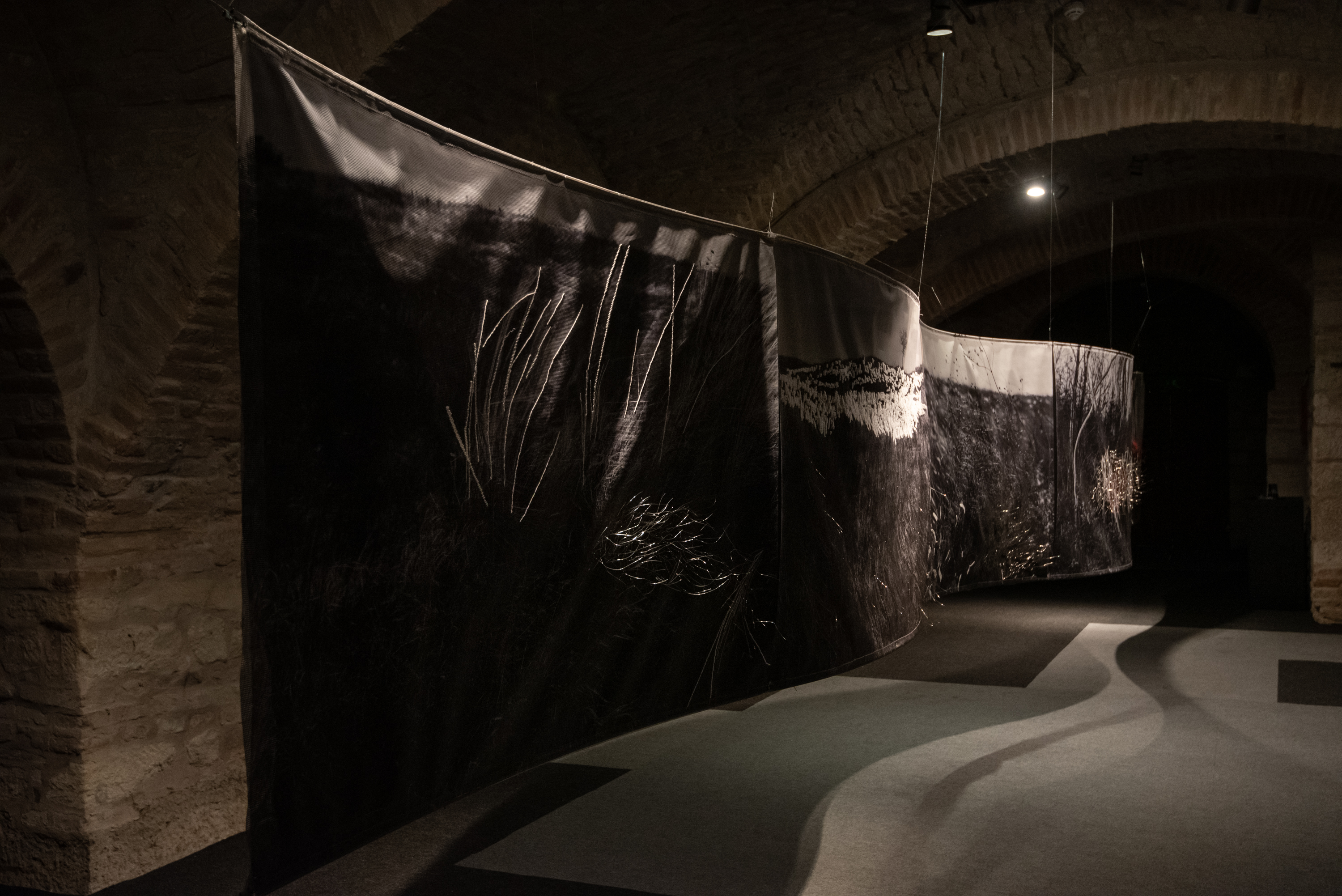 Floating installation in the space is made of twelve photographs in meter format with scenes of Deliblato Sands landscape. It stretches in the form of waves through darkened gallery space, and each visitor illuminates the work with a flashlight, thus attaining the evasiveness of experience of wholeness and detail. Interventions in the form of weaving with wire and wool were made on photographs, expanding photographic landscape into three-dimensional space, so to speak, the landscape “entering” the space and conquering an observer. Landscape interventions are a natural continuation of the motif in photography, accentuating it and bringing it to life. Through this installation, I am questioning the possibility of “transferring” the landscape beyond its reality and of changing perception from usual observation to a sensory experience. The landscape is the last refuge of a man and with this installation I remind the viewers of their origin, their connection with nature, the need for touch and emotion it produces. The installation is accompanied with a sound improvisation by musician and sound designer Marko Jevtić. This work is part of a research process conducted within doctoral studies in art, at the Academy of Arts in Novi Sad. -