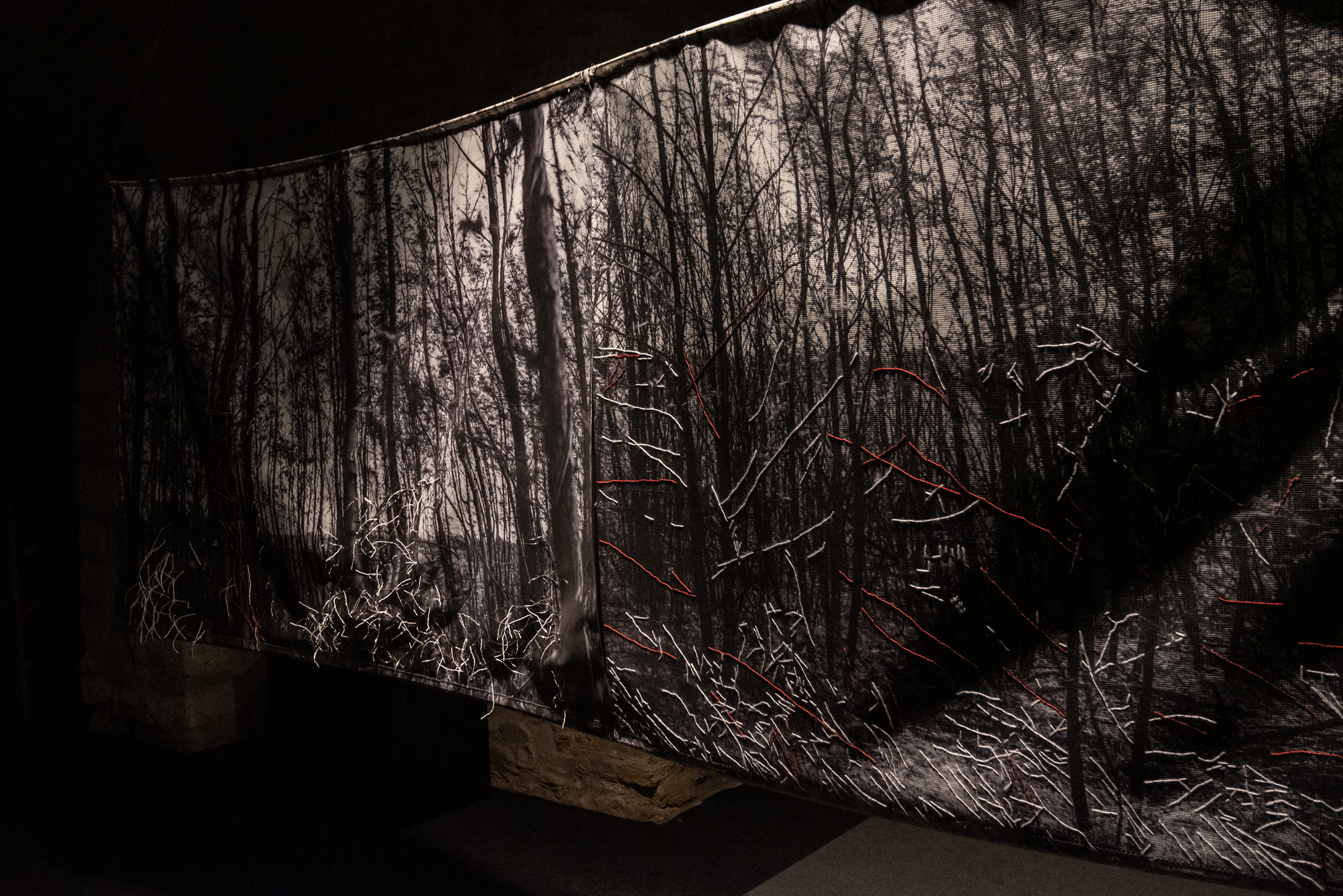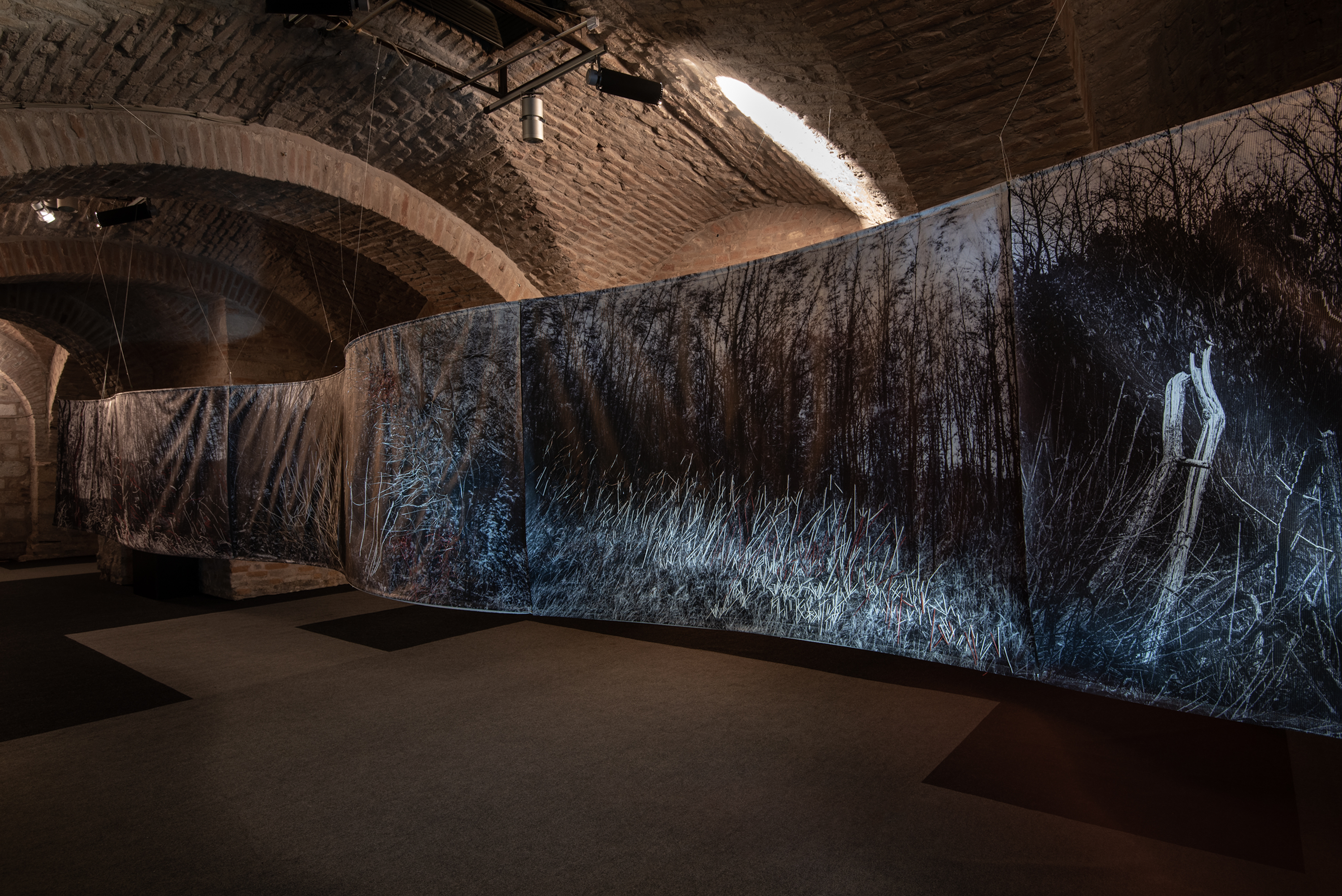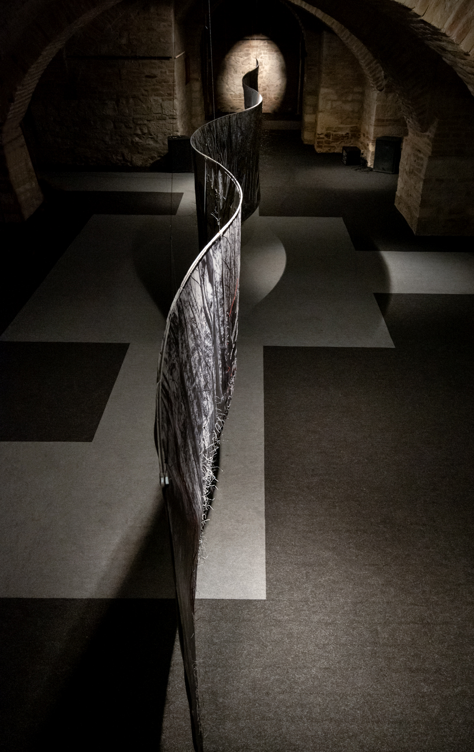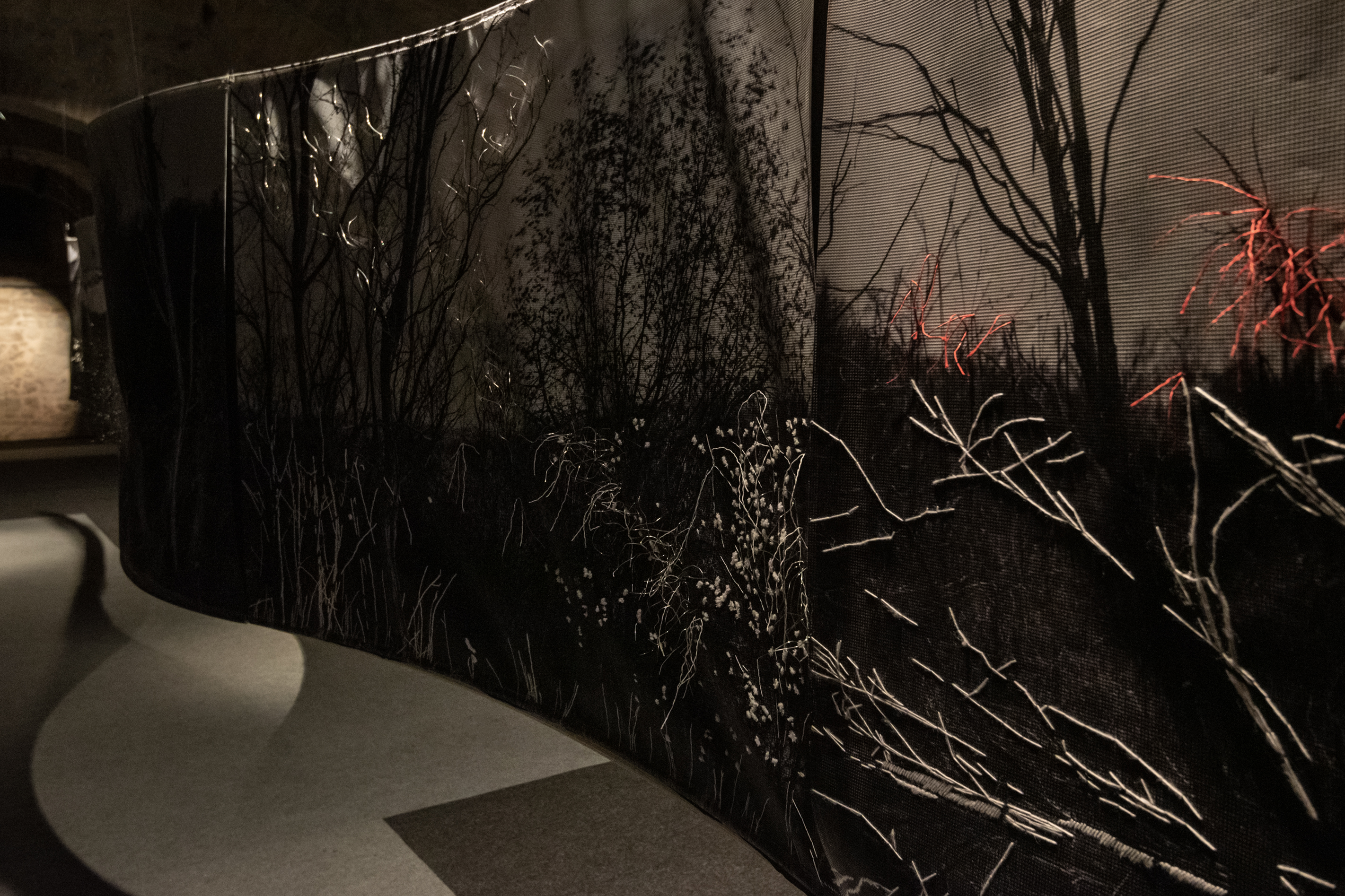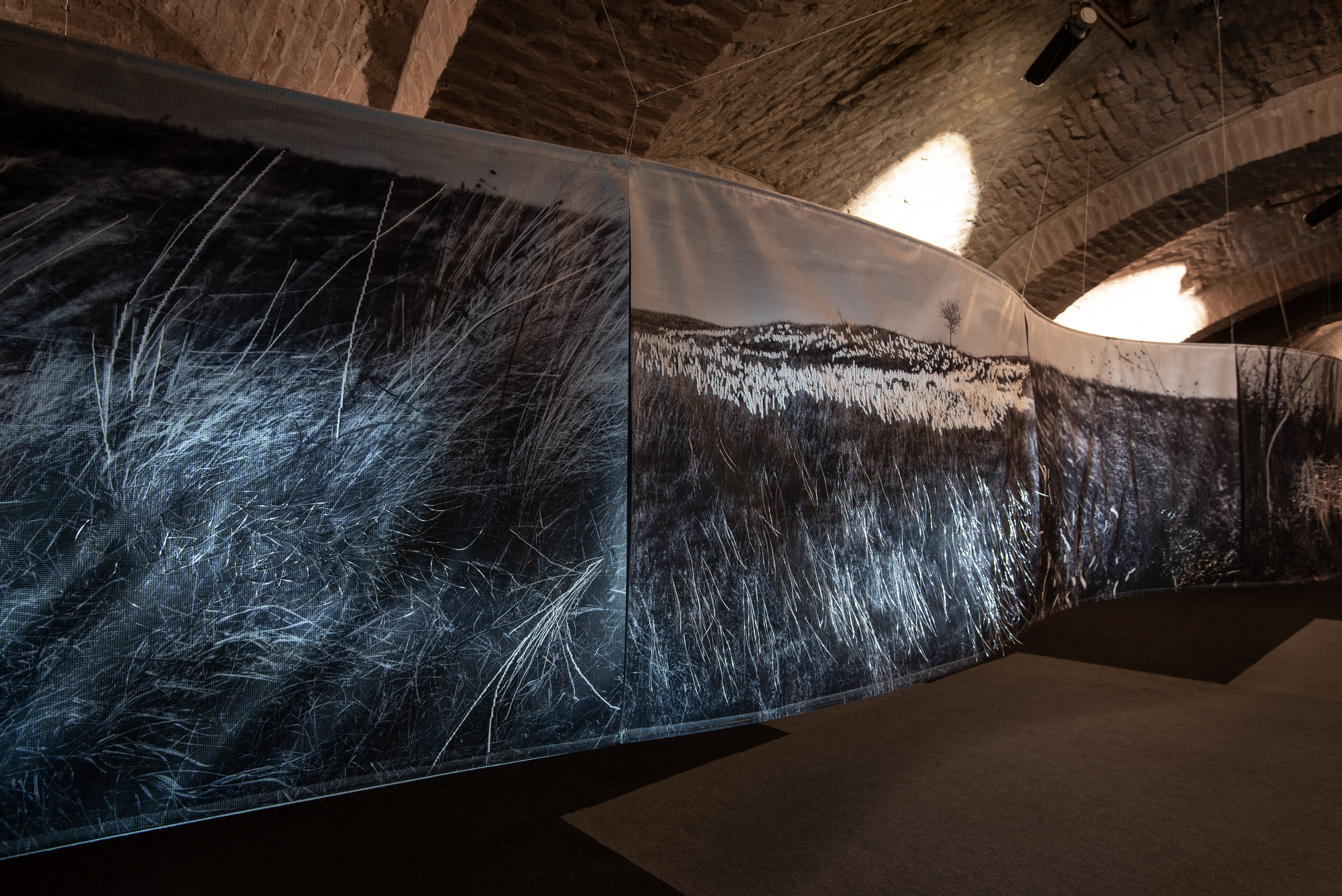Floating installation in the space is made of twelve photographs in meter format with scenes of Deliblato Sands landscape. It stretches in the form of waves through darkened gallery space, and each visitor illuminates the work with a flashlight, thus attaining the evasiveness of experience of wholeness and detail. Interventions in the form of weaving with wire and wool were made on photographs, expanding photographic landscape into three-dimensional space, so to speak, the landscape “entering” the space and conquering an observer. Landscape interventions are a natural continuation of the motif in photography, accentuating it and bringing it to life. Through this installation, I am questioning the possibility of “transferring” the landscape beyond its reality and of changing perception from usual observation to a sensory experience. The landscape is the last refuge of a man and with this installation I remind the viewers of their origin, their connection with nature, the need for touch and emotion it produces. The installation is accompanied with a sound improvisation by musician and sound designer Marko Jevtić. This work is part of a research process conducted within doctoral studies in art, at the Academy of Arts in Novi Sad. -