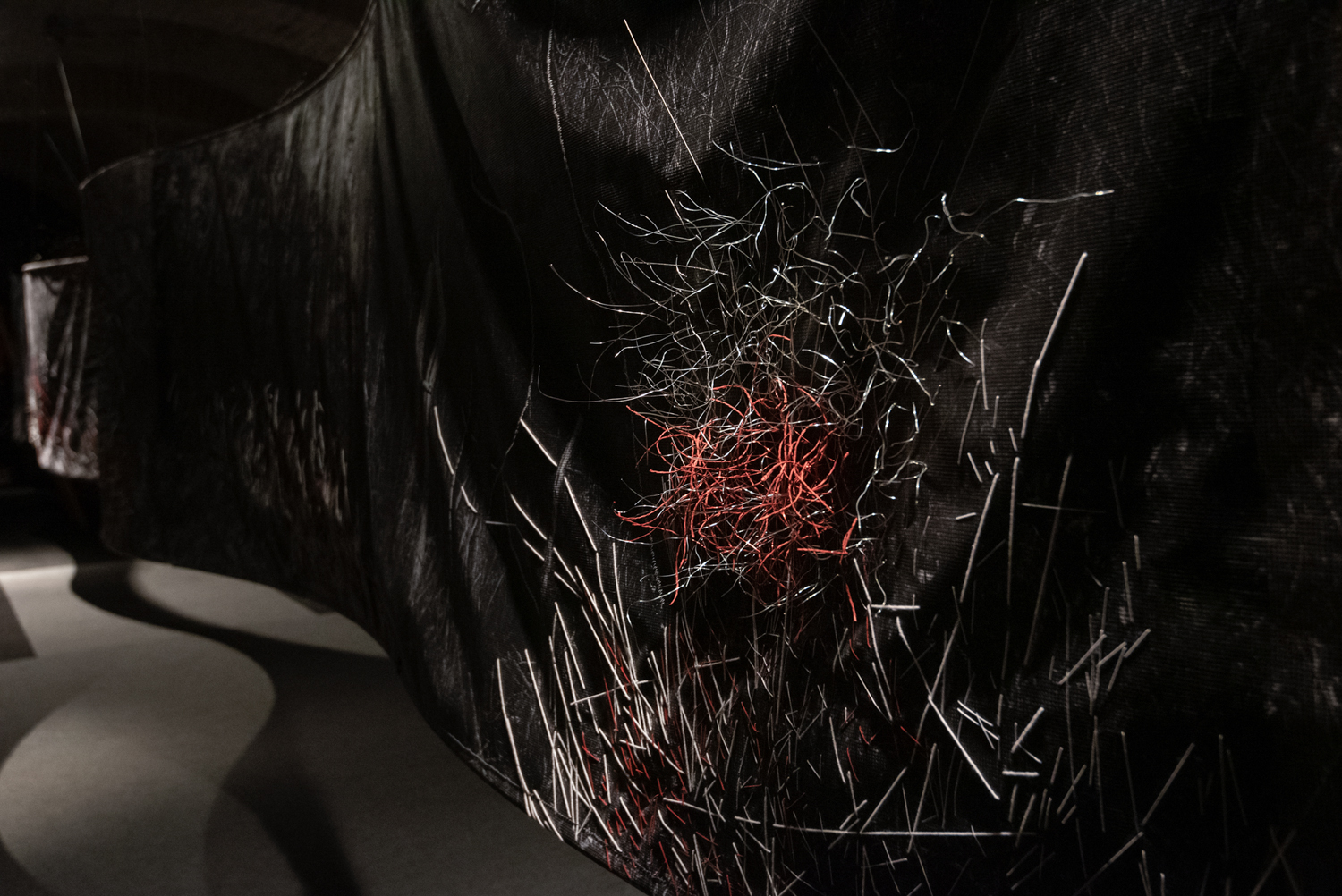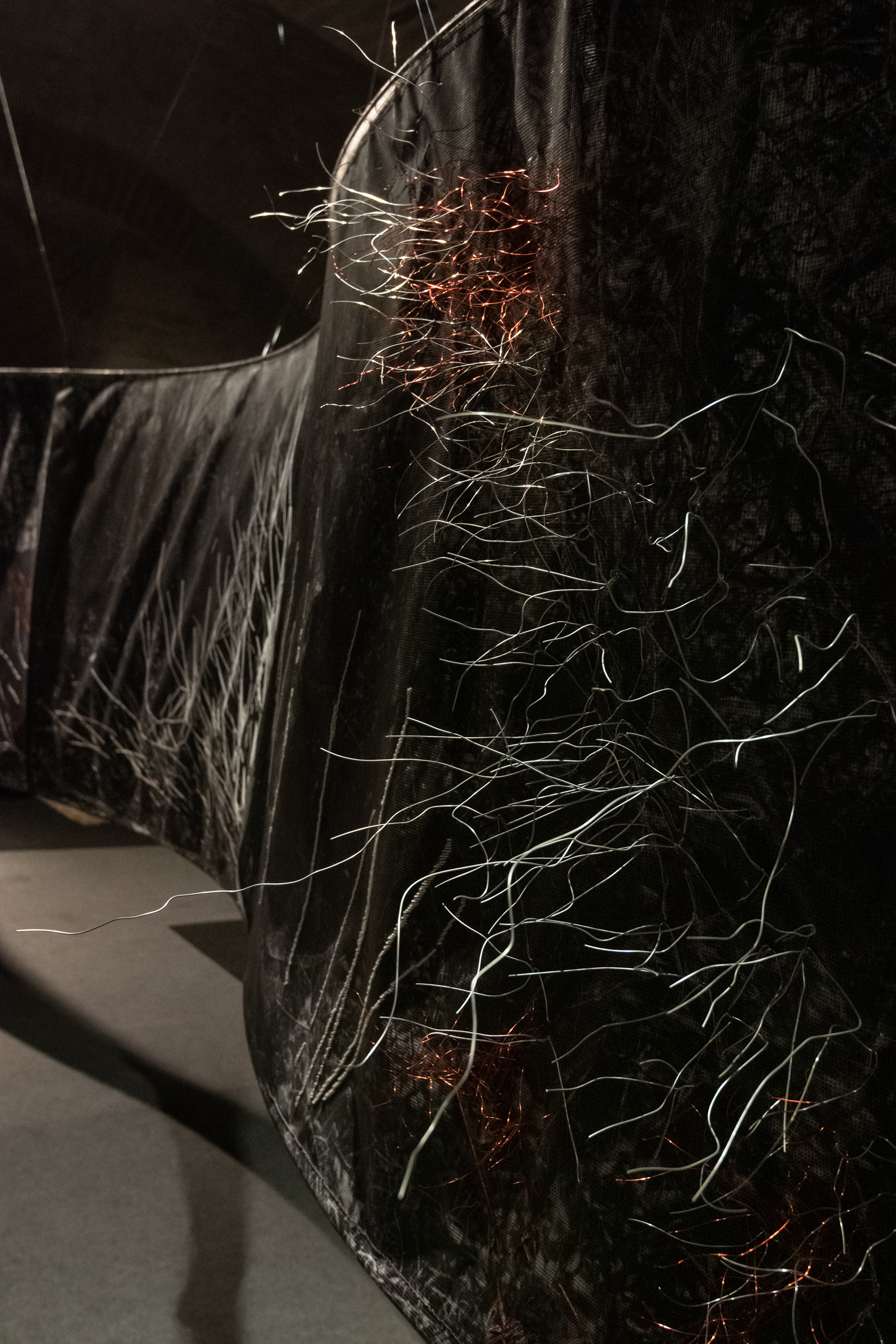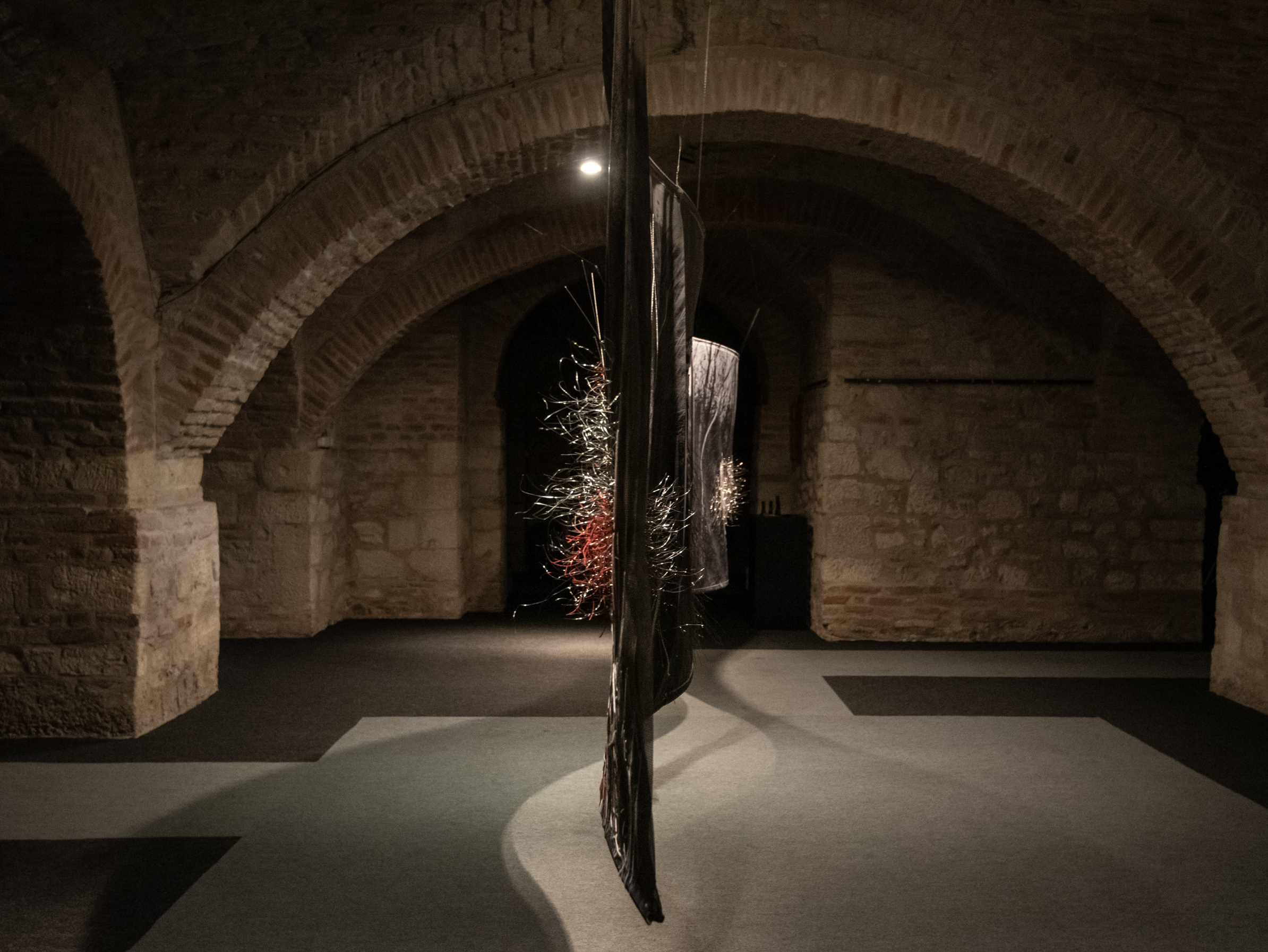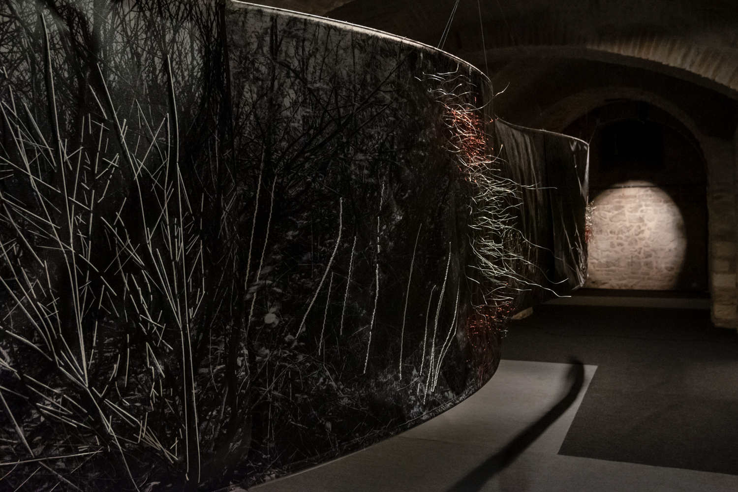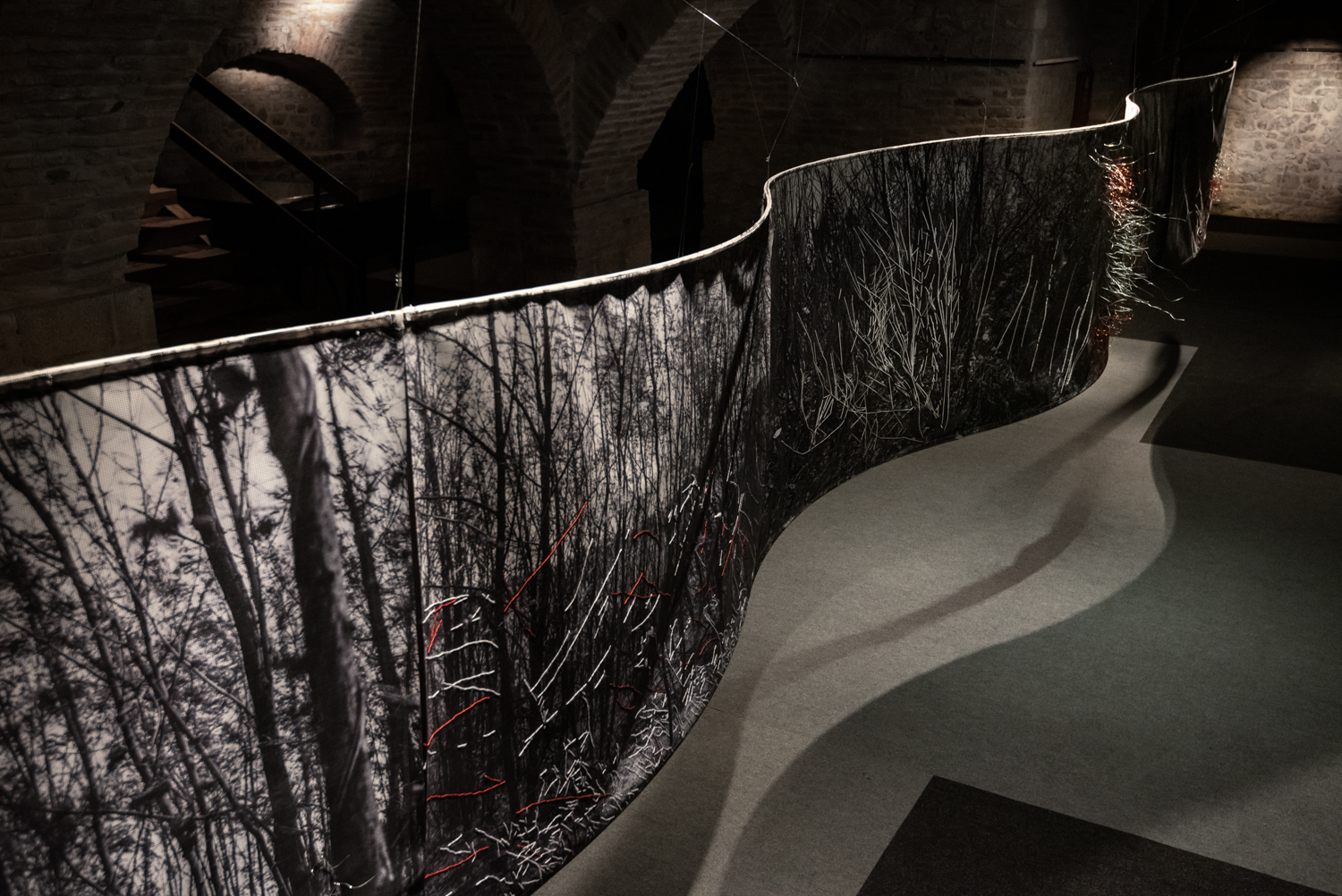 Floating installation in the space is made of twelve photographs in meter format with scenes of Deliblato Sands landscape. It stretches in the form of waves through darkened gallery space, and each visitor illuminates the work with a flashlight, thus attaining the evasiveness of experience of wholeness and detail. Interventions in the form of weaving with wire and wool were made on photographs, expanding photographic landscape into three-dimensional space, so to speak, the landscape “entering” the space and conquering an observer. Landscape interventions are a natural continuation of the motif in photography, accentuating it and bringing it to life. Through this installation, I am questioning the possibility of “transferring” the landscape beyond its reality and of changing perception from usual observation to a sensory experience. The landscape is the last refuge of a man and with this installation I remind the viewers of their origin, their connection with nature, the need for touch and emotion it produces. The installation is accompanied with a sound improvisation by musician and sound designer Marko Jevtić. This work is part of a research process conducted within doctoral studies in art, at the Academy of Arts in Novi Sad. -